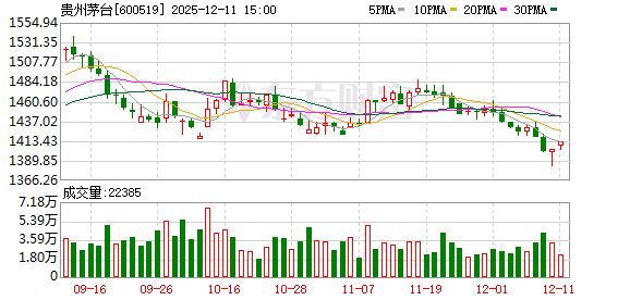 贵州茅台12月11日巨额往复平台出现一笔成交,成交量0.36万股,成交金额498.15万元,巨额往复成交价为1383.75元,相对本日收盘价折价2.00%。该笔往复的买方买卖部为中国星河证券股份有限公司北京北四环证券买卖部,卖方买卖部为东兴证券股份有限公司重庆邹容路证券买卖部。